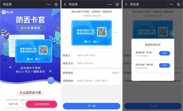 现在办理专属二维码防丢卡套,限时免费。需要的小伙伴,首先打开支付宝,搜索“寻证易”,然后点击免费领取,按要求填写之后,坐等就可以了,支付宝会将这个专属二维码防丢卡套邮寄给你。