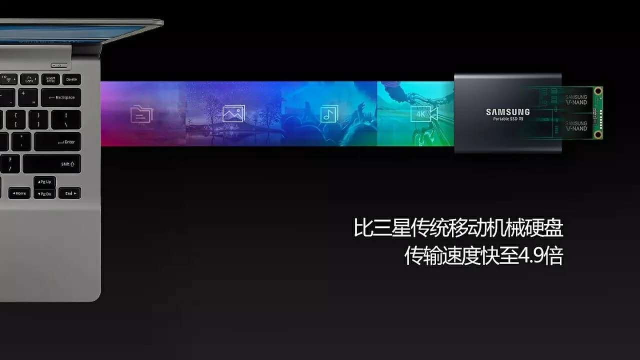 拥有三星V-NAND闪存和USB3.1Gen2接口,T5提供540MB/s传输速度,比外置HDD快4.9倍,传输和备份大型数据将会更迅速、更快,包括4K视频和高清照片。
