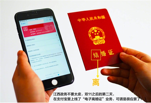 11月12月,支付宝官微称:“给小夫妻们分享一个实用的消息,今天,江西政务小程序非常贴心的推出了‘电子结婚’和‘电子离婚证’领取功能。”