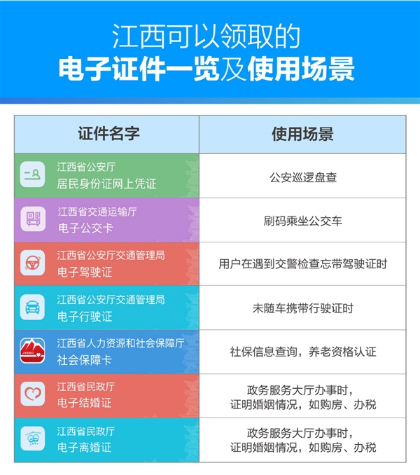 据江西省大数据中心主任金俊平介绍,此次上线的还包括身份证网证、电子驾驶证、电子行驶证,江西也由此成为全国电子证件类型最多、覆盖范围最广的省份。市民在政务服务大厅办事时发现忘带证件时,通过领取电子证件,就可办理,不再折返跑。