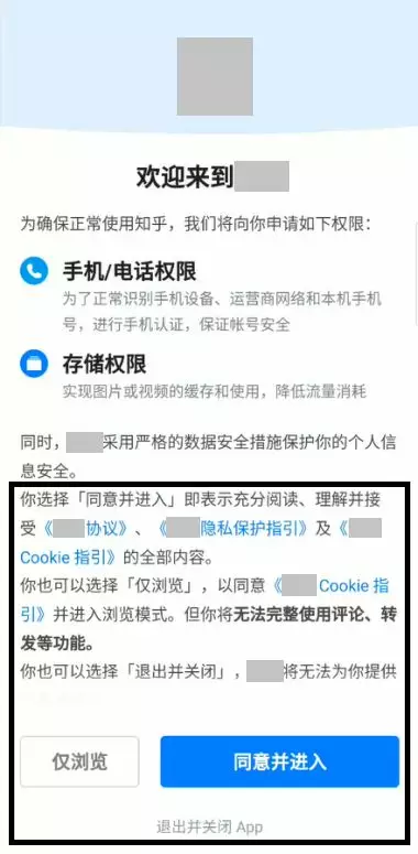 个人信息收集使用规则不应存在默认勾选或默认同意(如“点击登录/注册即同意”)等情况,如图14所示。应提示用户阅读由用户主动选择同意,如图15所示。可在首次打开时提供“不同意,仅浏览”、“同意并进入”及“不同意,退出并关闭APP”等多种选项供用户进行自主选择,如图16所示。