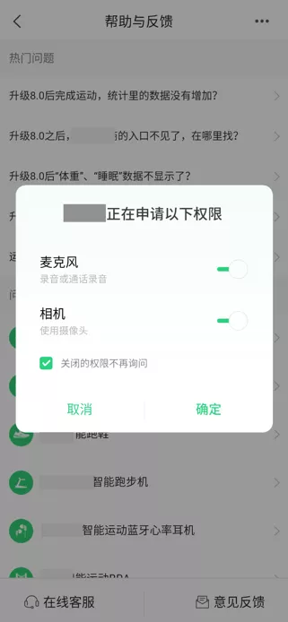 权限申请应与当前应用业务功能或场景有关,不应过度索取权限。如应用申请可收集个人信息的权限,但无与所申请权限相关的业务功能;或应用申请可收集个人信息的权限,但申请时不存在相关的业务功能或场景。例如,用户点击应用在线客服功能入口中,向用户弹窗申请开启相机、麦克风权限,此时并未实际使用麦克风、相机,如图18所示。