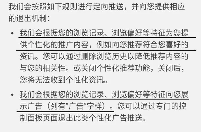 隐私政策中应清晰告知使用用户信息进行用户个性化内容及广告的推送。如图25所示,明确区分个性化展示、推送信息和商业广告,便于用户更好地理解。