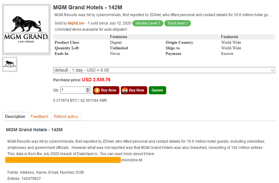 根据这则广告,黑客以略高于2,900美元的价格出售了142,479,937名米高梅酒店客人的详细信息。