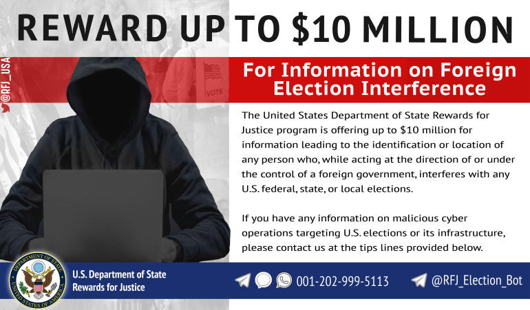 美国国务院宣布,如果有任何信息能够识别任何与外国政府合作或为外国政府工作的人,通过“非法网络活动”干扰美国选举,国务院将给予高达1000万美元的奖励。
