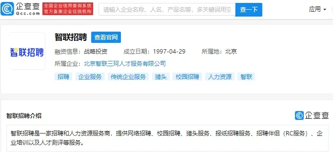 企查查 APP 显示,315 晚会曝光的智联招聘是一家招聘和人力资源服务商,隶属于北京智联三珂人才服务有限公司,该公司成立于 1997 年,法定代表人为郭盛,注册资本 110 万元人民币,经营范围包含:为劳动者介绍用人单位;为用人单位推荐劳动者;为用人单位和个人提供职业介绍信息服务等。企查查风险信息显示,该公司曾因 “擅自从事互联网视听节目服务”被行政处罚,处罚单位为北京文化市场执法总队。
