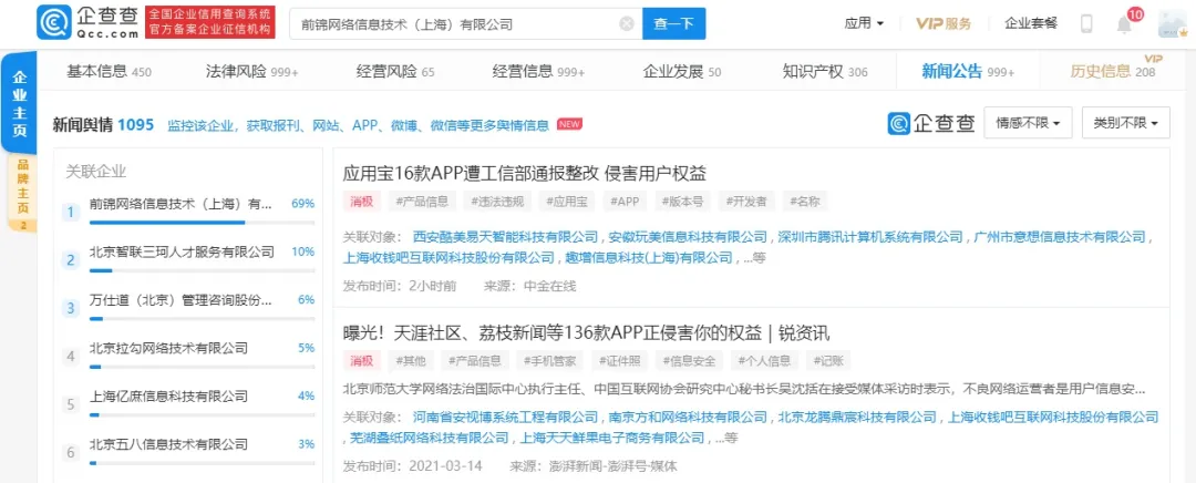 企查查 App 显示,315 曝光的前程无忧隶属于前锦网络信息技术(上海)有限公司,成立于 2000 年 1 月,注册资本 500 万美元,是一个人力资源服务机构,提供包括招聘猎头、培训测评和人事外包在内的全方位专业人力资源服务。公司裁判文书共 809 条,用户投诉可查记录 43 条。