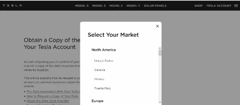 在特斯拉官网“隐私政策”部分,南都记者逐一切换市场地区进行查询,发现如果选择了“美国”,官网页面就会跳转至如何获取行车数据的教学页面;但如果选择美国之外的其他地区,则只会弹出“近期热门话题”等无关页面。