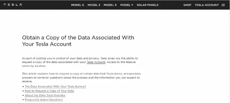 根据介绍,美国车主在登陆自己的特斯拉账号后,可以向特斯拉方面申请复制自己的行车数据,包括了账户信息、发车前准备、行车信息、自动驾驶信息、行车记录仪信息、娱乐系统使用信息、移动App使用信息等,但不被特斯拉记录或与该车主无关的信息不提供下载。提交申请后30日内,特斯拉将数据整理成“容易理解的版本”,通过邮件发送给车主,车主需要在2日之内下载。