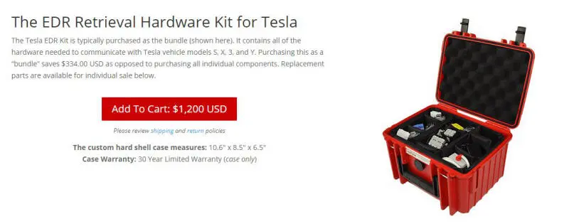 此外,特斯拉还在北美大陆上线了事件数据记录器EDR(Event Data Recorder)查询软件,供所有车主查询“黑匣子”EDR记录的车辆行驶数据。该软件部分免费,可在特斯拉官网上下载,但连接EDR所需的硬件USB-Can Bus数据线则需要车主自行购买。据悉,一套完整的EDR查询套件官网售价为1200美元。该查询套件目前仅在北美(美国、加拿大)地区销售,特斯拉表示也不会解码北美以外地区制造的特斯拉车辆的数据。